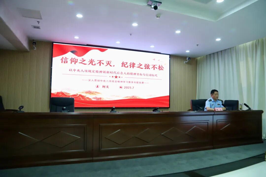 会议最后,局党委书记、局长以“信仰之光不灭,纪律之弦不松,以中央八项规定精神铸新时代应急人的精神”为题,为全局党员干部讲授了一堂生动的专题党课。柯文强调,要以信仰铸魂,从百年党史中汲取精神伟力。深刻领会从延安整风到中央八项规定精神的历史传承,以精神谱系为熔炉,把“对党忠诚、纪律严明、赴汤蹈火、竭诚为民”重要训词精神融入血脉,在防汛救灾、安全生产等实战中锤炼政治品格;要以规矩立身,深入贯彻中央八项规定精神学习教育。坚持系统学、精准查、长效改,以中央八项规定精神为“标尺”,量一量自身思想纯度、作风硬度,让“对党忠诚”的誓言真正转化为“清正用权”“铁肩担当”的行动自觉;要践行使命,推动作风建设与应急管理深度融合。锤炼绝对忠诚,提速应急响应,熔铸清廉公信,锻造“心中有党、肩上有责、应急有招、行为有戒、温暖有光”的“五有”应急铁军;要从我做起,以赤诚之心走好新时代赶考路。持续增强抵御自然风险、人为风险及系统挑战能力,筑牢预判、响应和协同多重防线,把自己熔铸为铁军链条中最硬钢环,把岗位打造成安全网络最牢绳结,在新时代应急“赶考路”上交出不负人民的满意答卷。