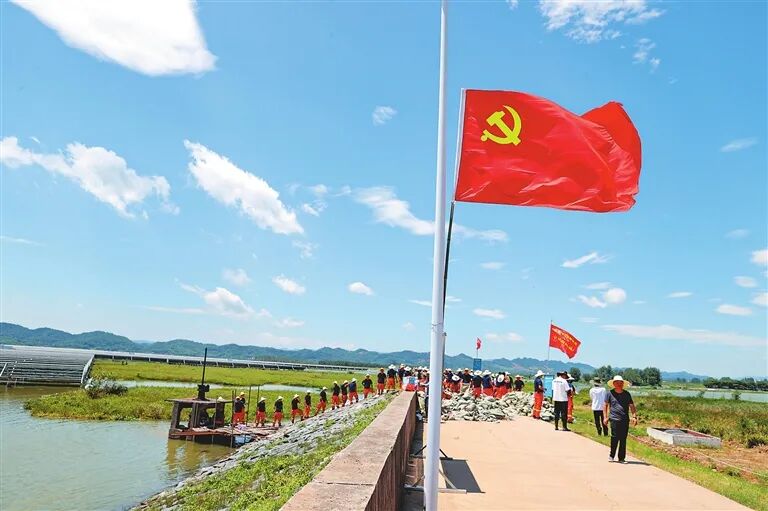 党旗高高飘扬在防汛救灾第一线。(九江日报全媒记者 刘家 摄)
